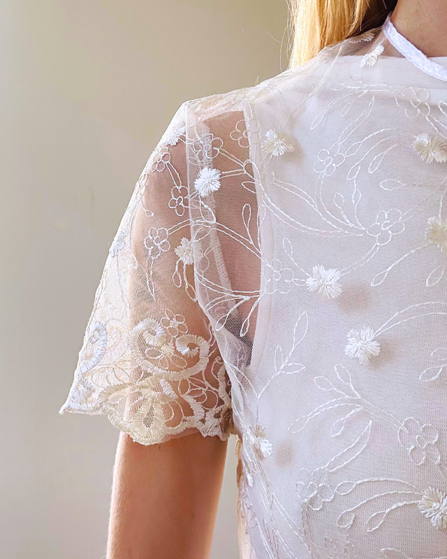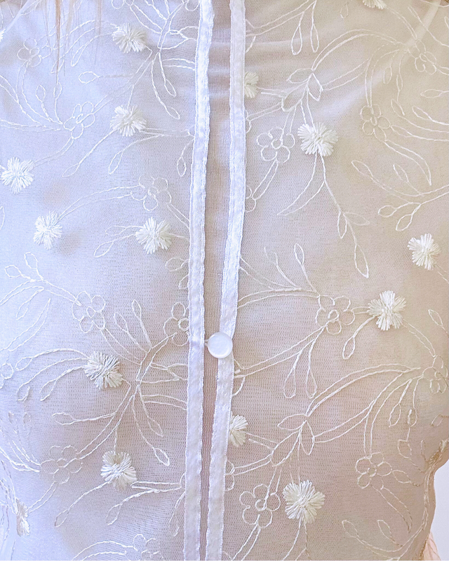 Light as air and intricately detailed, this cropped sheer jacket is crafted from fine tulle embroidered with tonal floral motifs and subtle pearly accents. Featuring short sleeves, a flattering cropped silhouette, and a delicate front closure with three small buttons, it layers effortlessly over the matching mini skirt. Ideal for a civil wedding, summer event, or romantic evening, this jacket adds a refined touch of coverage without hiding your outfit beneath.