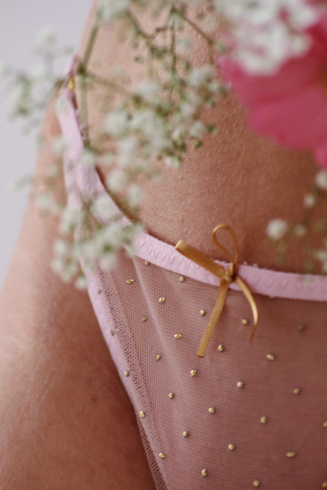 Complete your captivating ensemble with the "Gloria Thong", a perfect match to the alluring "Gloria Bralette". Crafted in delicate pale pink sheer tulle, this thong exudes elegance and allure. Adorned with tiny gold dew drops, it offers a touch of delicate charm. Embrace the enchanting allure and exquisite comfort of the "Gloria Thong" and complete your look with timeless beauty and undeniable grace.