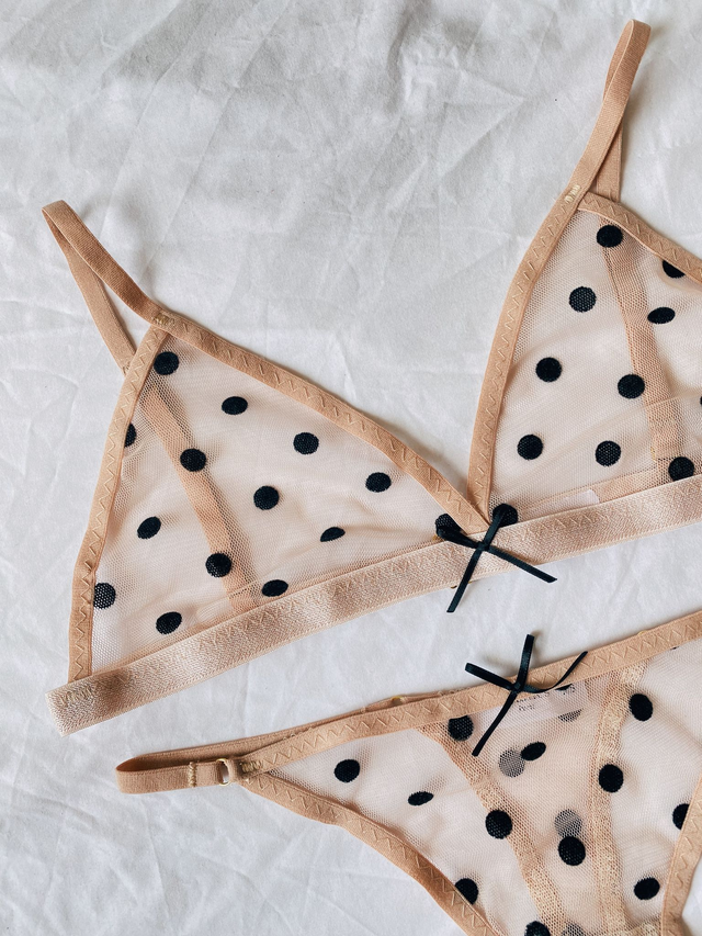 Our Jenna Thong lays softly on the skin for the perfect fit. Featuring black velvet polka dots laid on soft beige mesh, this thong is perfect for all comfort queens.
